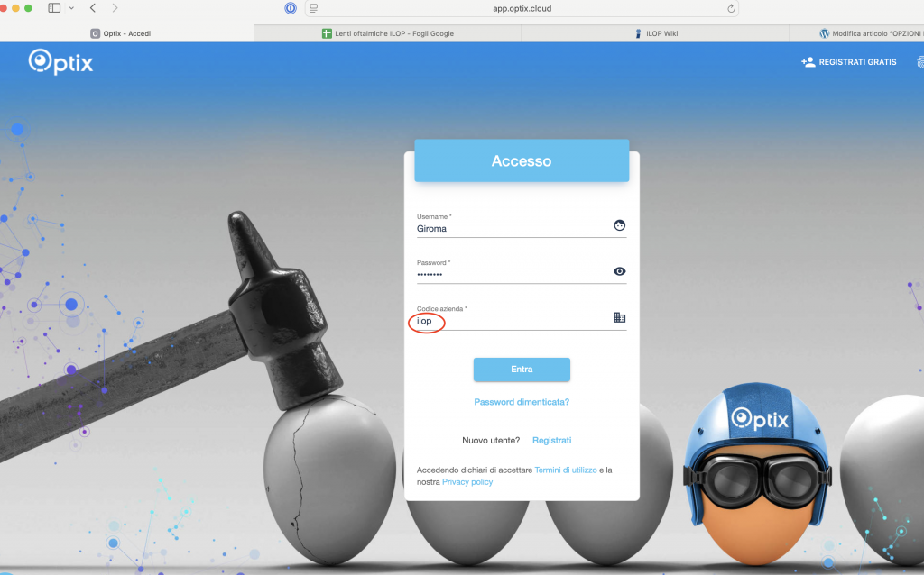 Per accedere basta inserire il proprio nome utente ricevuto via mail, la password creata e nella sezione “codice azienda” scrivere “ilop” senza maiuscole e senza punti.