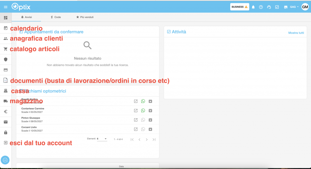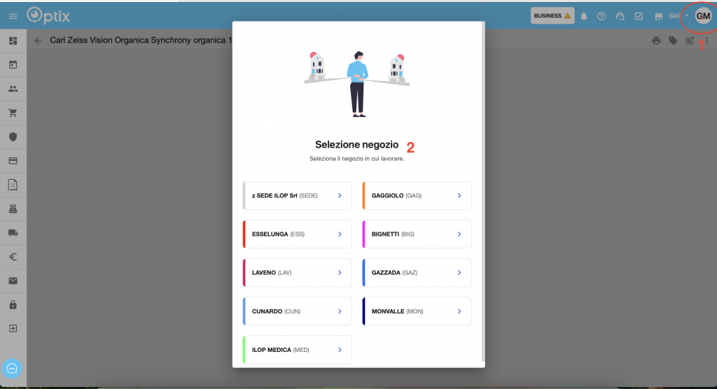 Dopo aver effettuato l’accesso, in alto a destra (1) vediamo le iniziali dell’utente che sta usando Optix