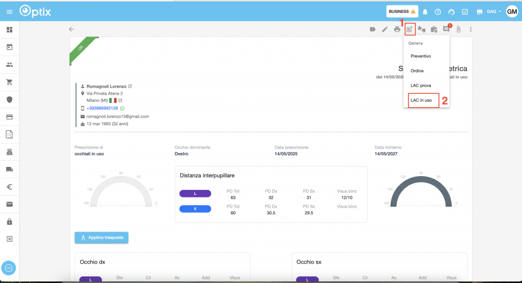 3- dopo aver selezionato l’optometria più recente selezioniamo “genera” (1) selezioniamo “lac in uso” (2)