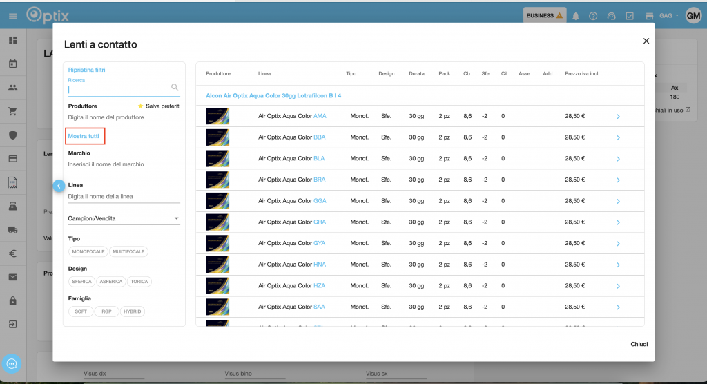 apertasi la pagina “Lenti a contatto” selezioniamo “mostra tutti” i produttori