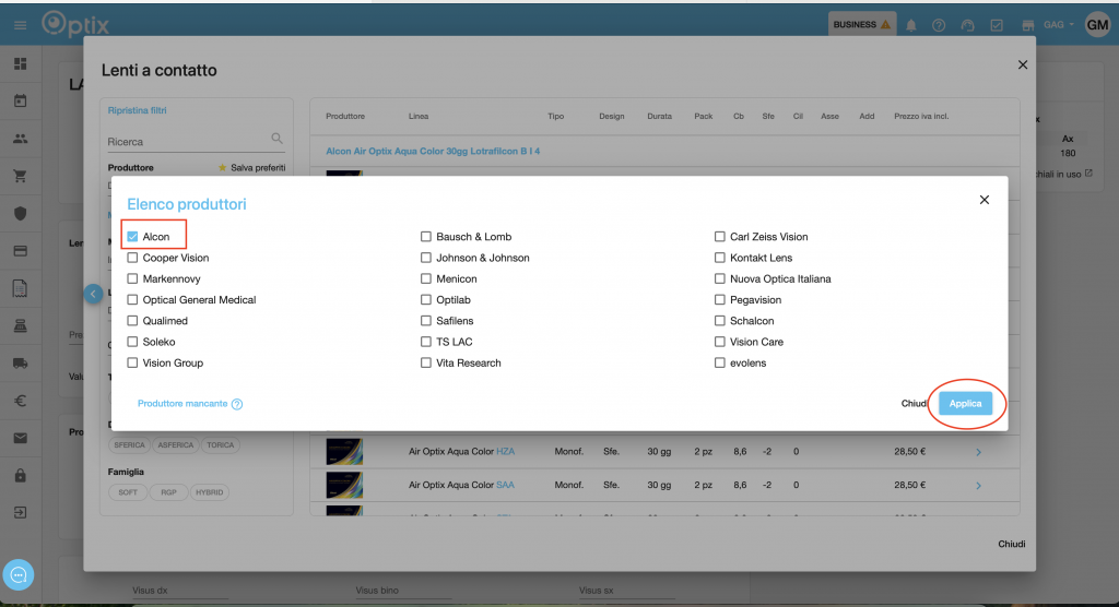 selezioniamo il marchio che mi interessa “es. Alcon” e clicchiamo su “applica”