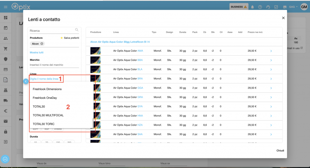a questo punto clicchiamo su “linea” (1) e possiamo scrivere il nome della lente che vogliamo (es. total 1) oppure scorrere tendina (2) per trovare la linea che ci interessa. una volta individuata ci clicchiamo sopra.