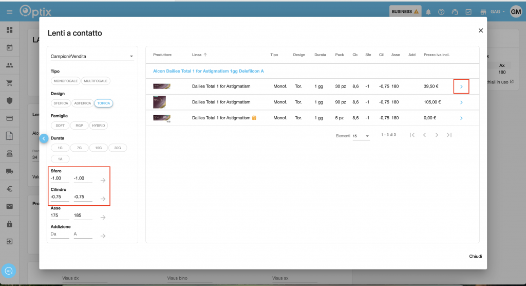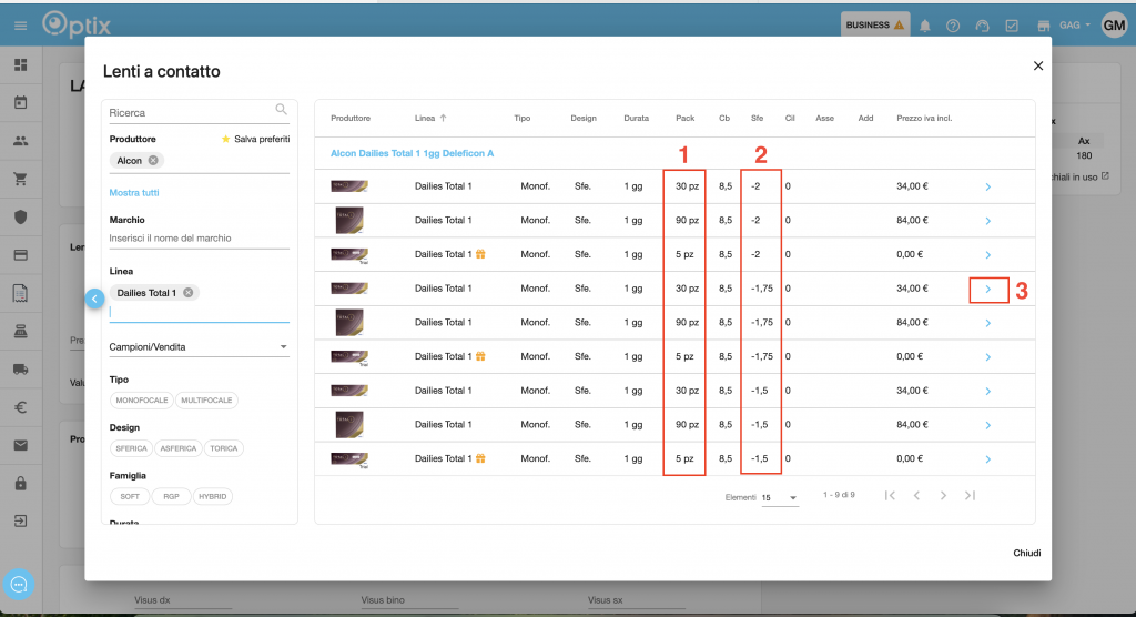 qui ci si apre la pagina con le varie opzioni di grandezza scatola (1) e le opzioni di potere (+/-0.25) (2). Individuata la lente che ci interessa la selezioniamo (3).