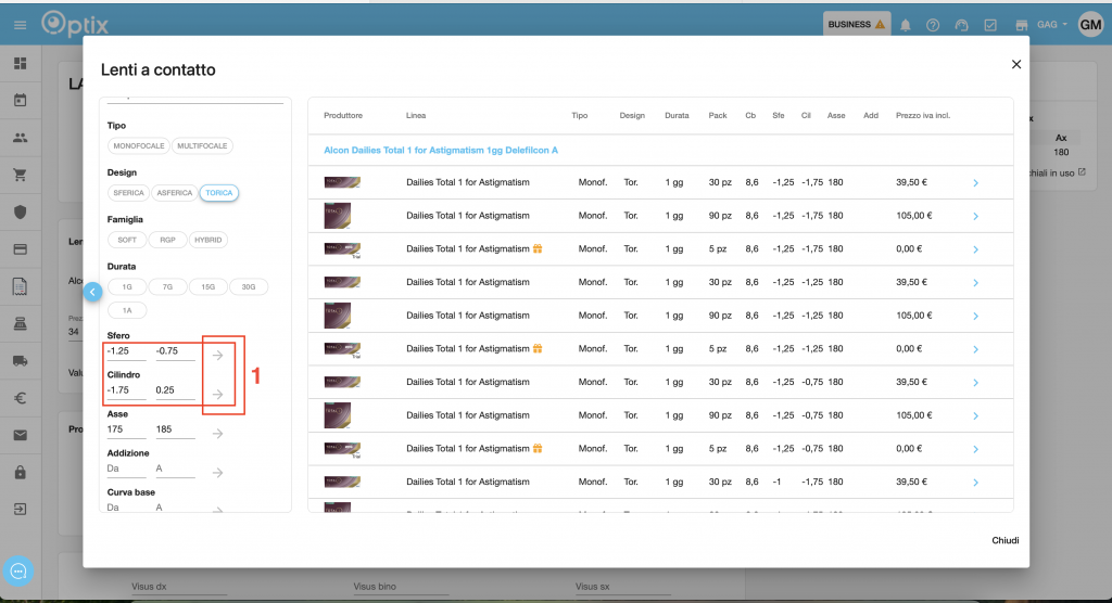 ci si aprono le opzioni lenti, possiamo sfoltire le opzioni andando ad inserire la diottria corretta ricordandoci di cliccare sempre le freccine a destra (1)