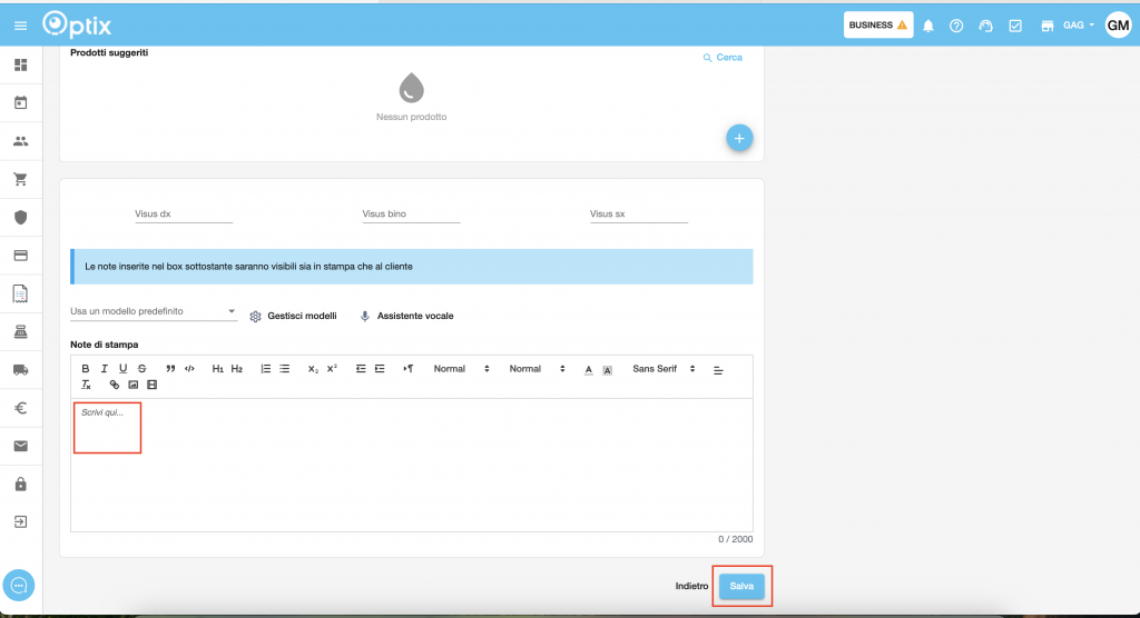 possiamo sempre inserire le note (nibut, menisco lacrimale, pieghe congiuntivali, centratura e movimento lente etc) poi possiamo salvare.